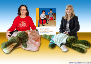 In einer Bewegungsgeschichte, die auch im Fachbuch enthalten ist, nehmen die beiden Nilkrokodile Nils und Ilse die Kinder mit auf eine phantastische Reise ins Turnland und bringen ihnen viel bei. Das Bild zeigt die beiden Autorinnen Gisela Schlesinger (li) und Stefanie Kuhlenkamp (re) zusammen mit den Krokodilen Ilse und Nils.